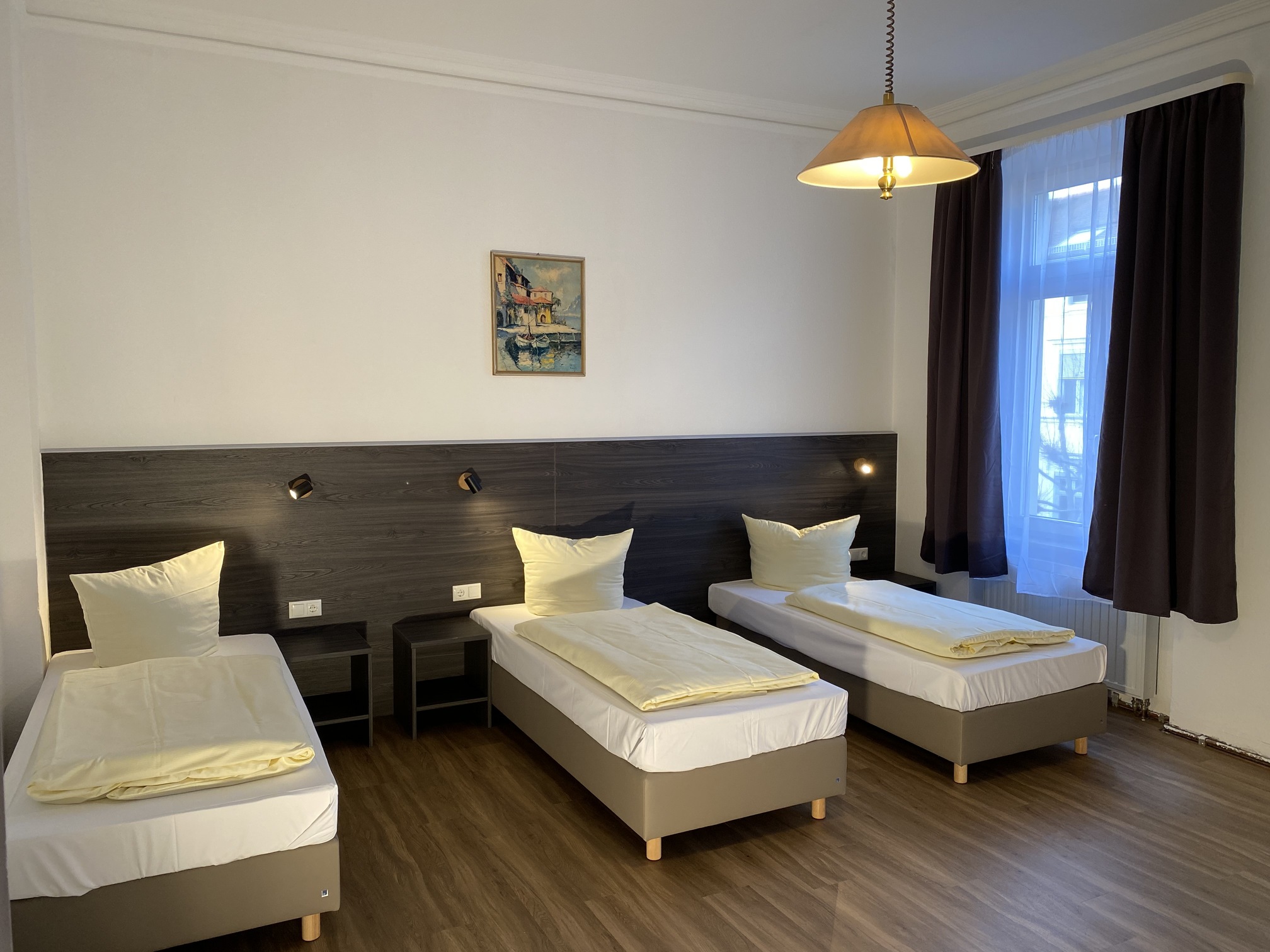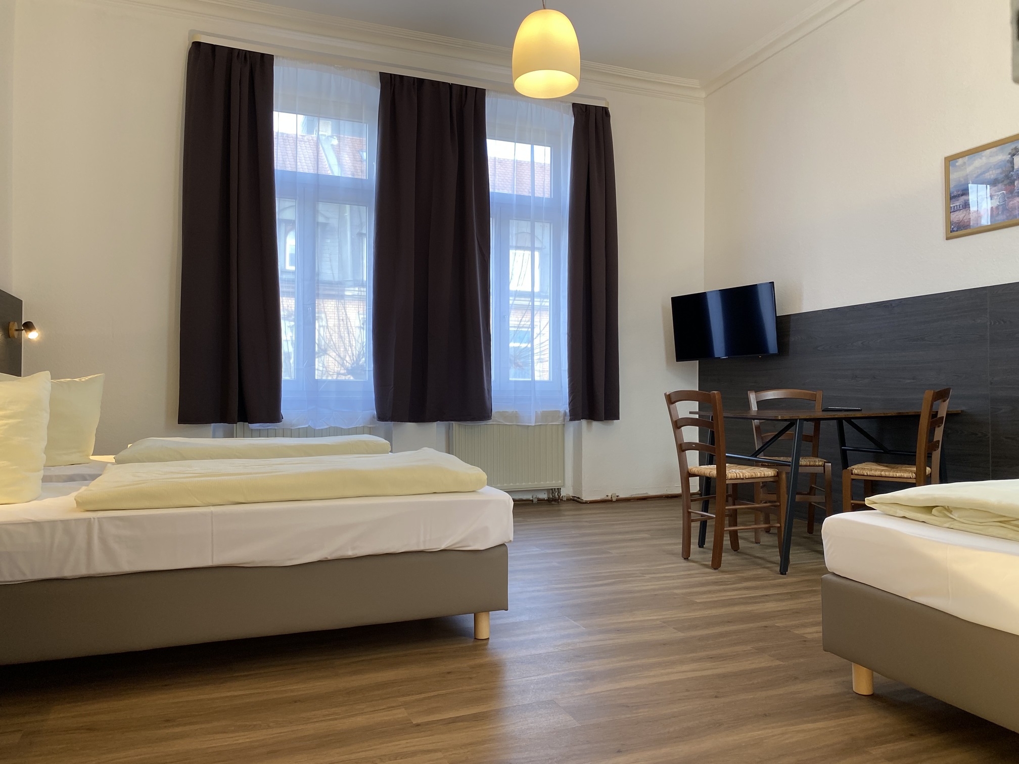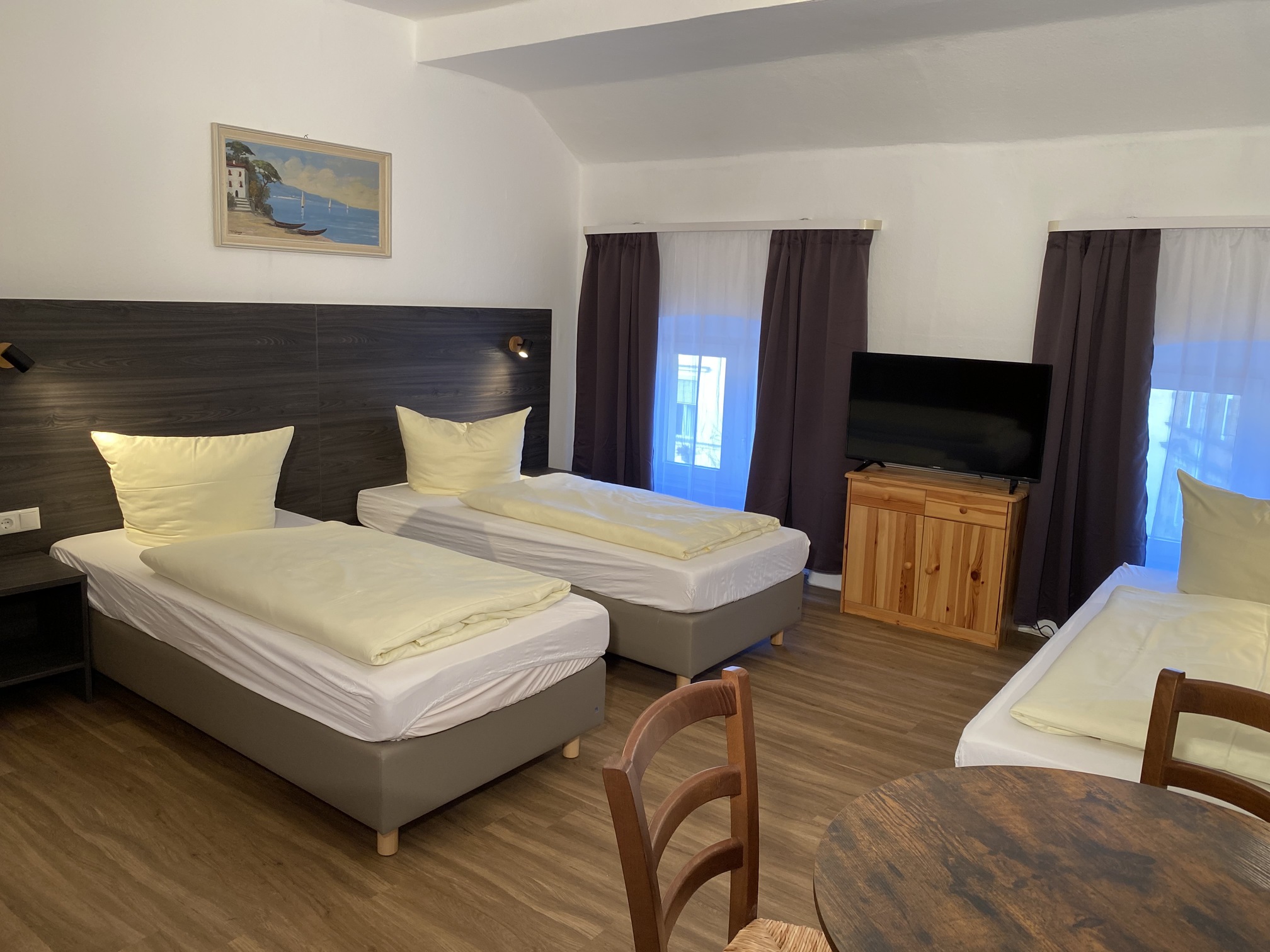 Das 3‑Zimmer Appartement unterteilt sich in drei Wohn- bzw. Schlafräume mit 2 Doppel und einem Dreibett, verfügt über 2 Badezimmer mit Dusche und einer Wohnküche.